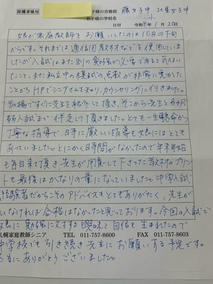 今回の入試で、娘に勉強に対する興味と自信も生まれたので、中学校でも引き続き先生にお願いする予定です。