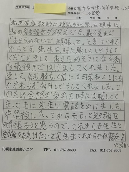 文面から、生徒の合格の喜びが、ひしひしと伝わってきます。