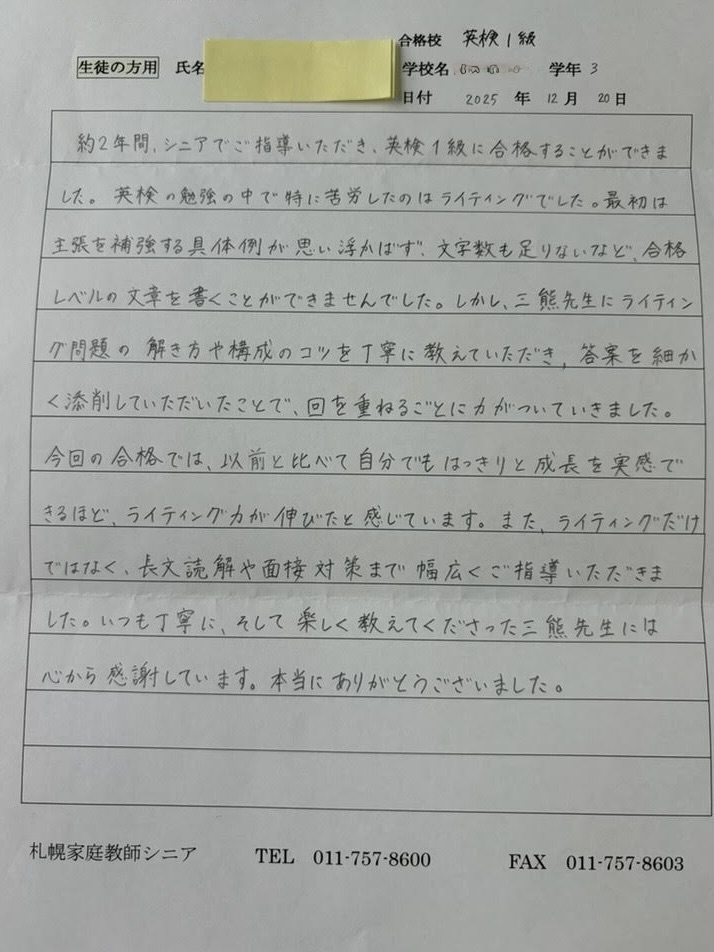 札幌市内近郊の私立中学3年生の生徒の方が、2025年11月、無事に英検1級に合格しました。