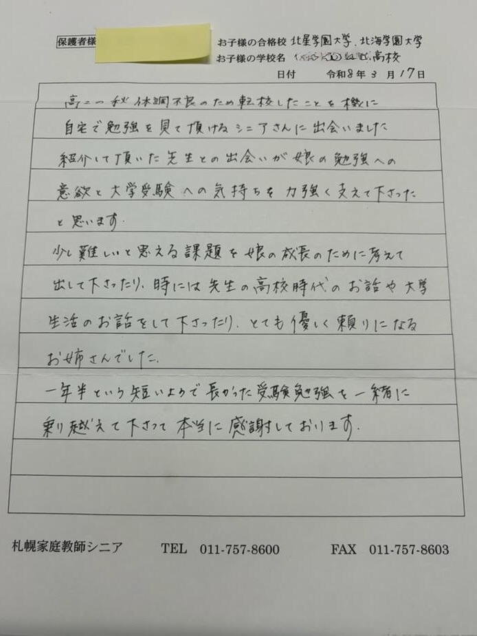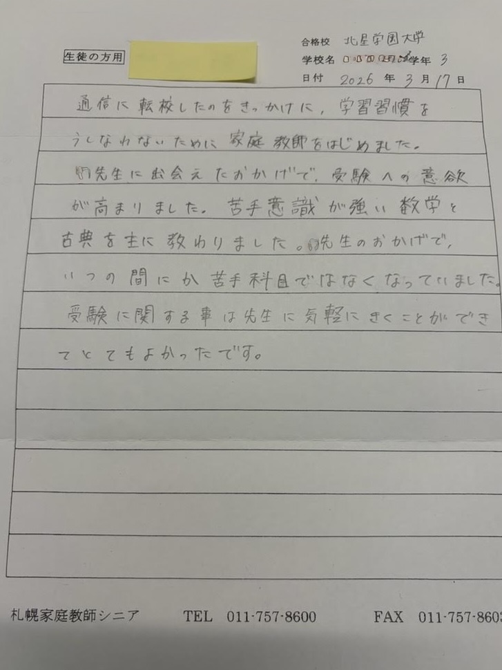 2026年度の大学入試において、札幌市内の通信制高校3年生の方が、北海学園大学(人文学部)、北星学園大学(国際学部)に無事合格しました。
