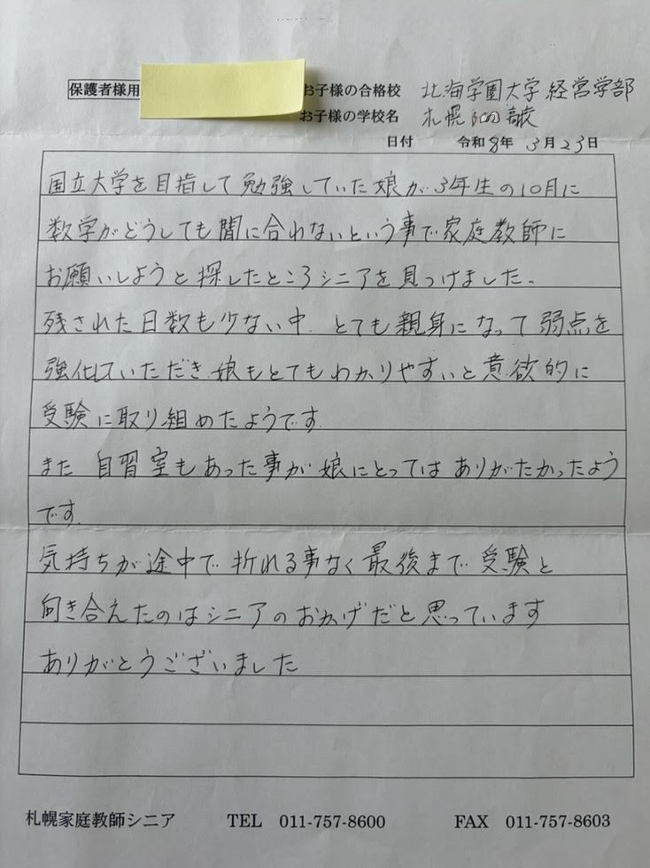 2026年度の大学入試において、札幌市内の公立高校3年生の生徒の方が、北海学園大学(経営学部)に無事合格しました。