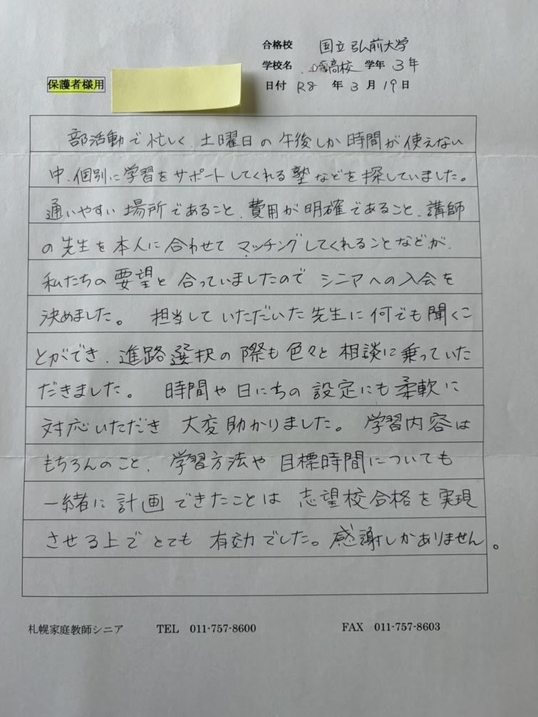 2026年度の大学入試において、札幌市内の私立高校3年生の生徒の方が、弘前大学教育学部に無事合格しました(一般選抜)。