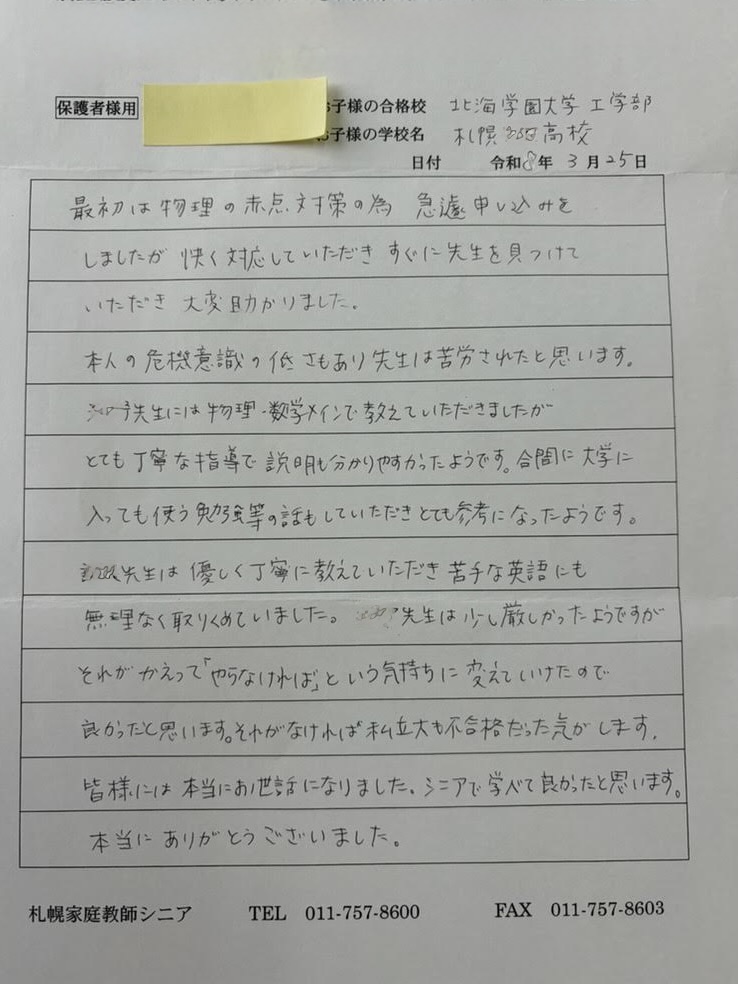 2026年度の大学入試において、札幌市内の中高一貫校の生徒の方、北海学園大学(工学部)、北海道科学大学(情報科学部)に無事合格しました。