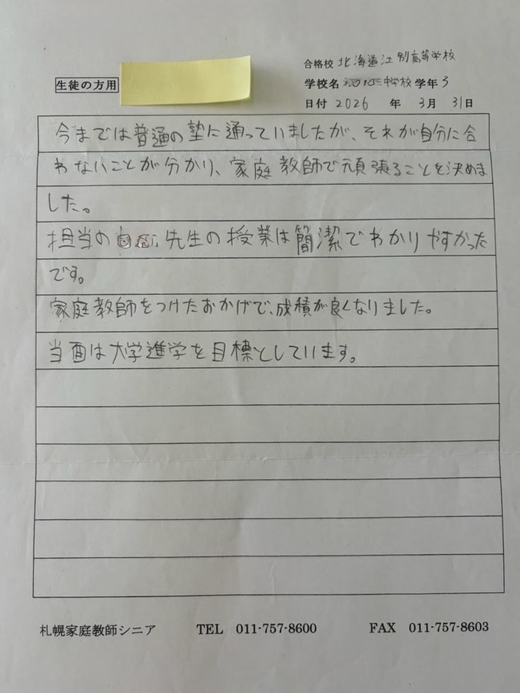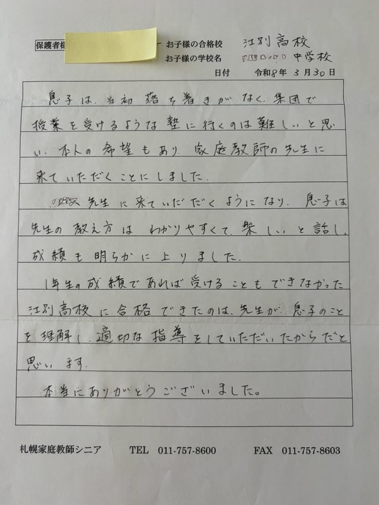1年生の成績であれば受けることもできなかった江別高校に合格できたのは、先生が息子のことを理解し、適切な指導をしていただいたからだと思います。
