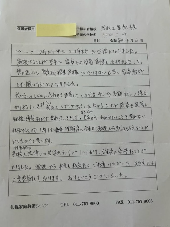 2026年度の高校入試において、札幌市内の生徒の方が札幌琴似工業高校に無事合格しました。