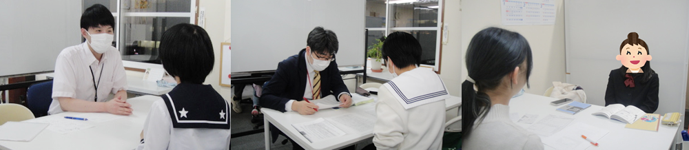 したがって、学校での授業、定期テスト、模試を軸にしながら、効果的な学習を進め、生徒一人一人のそれぞれ違う学習課題の補完・補強が指導のポイントになります。
